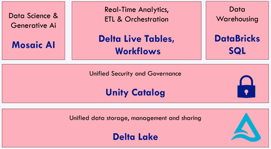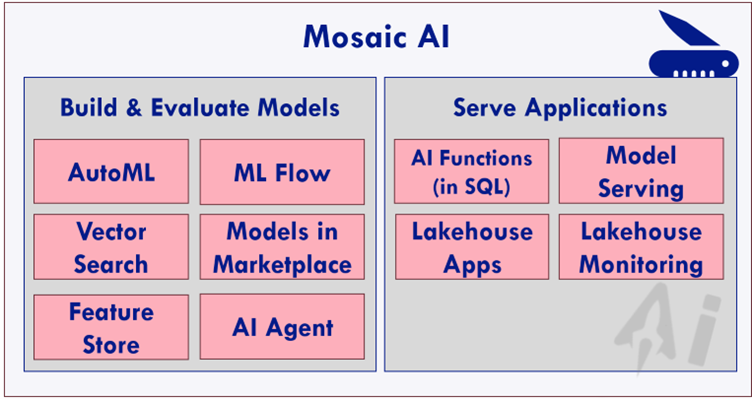 Mosaic AI: A set of AI-based components aiding all who use DataBricks in providing state-of-the-art functionalities and making AI available to the masses. This includes AutoML, MLFlow, Vector Searches, Feature Stores and much more.