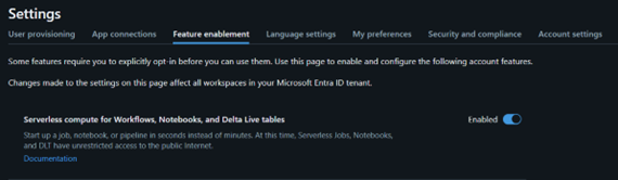 Here, the feature “Serverless compute for Workflows, Notebooks, and Delta Live tables” needs to be enabled.
