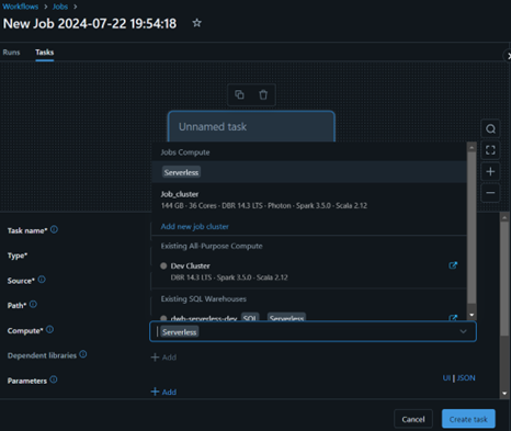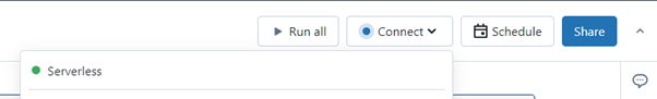 For workflows, it is possible to select the serverless compute in the Compute options list. These workflows have the advantage that multiple tasks can be executed on the same compute.