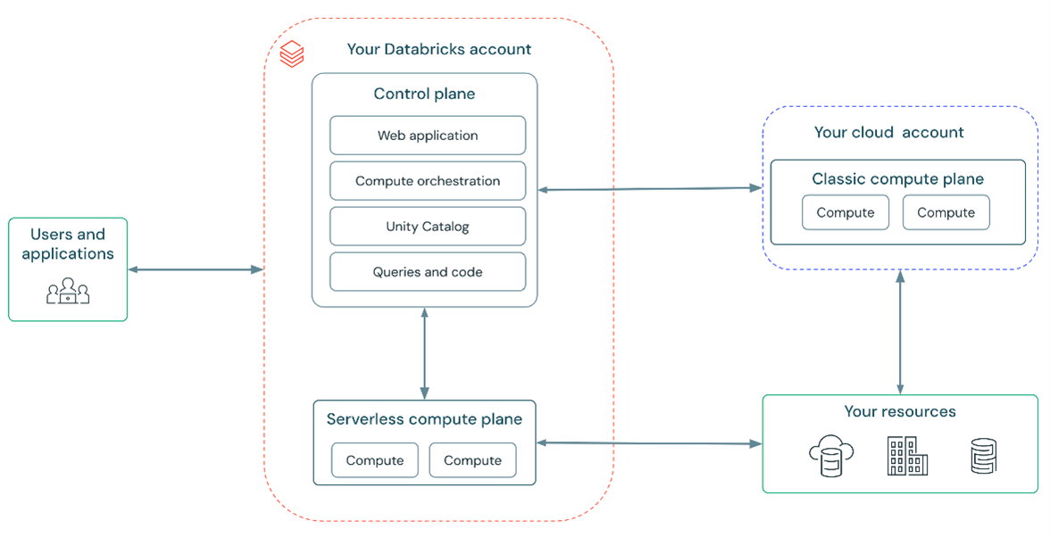 On the right, we see the cloud account with the classic compute plane where normally you manage your own resources. The serverless compute plane here is located inside the Databricks account. This means that databricks manages all computes instead of having to do it yourself. This is still connected to the same resources used with Databricks so shifting to serverless requires minimal effort and changes.