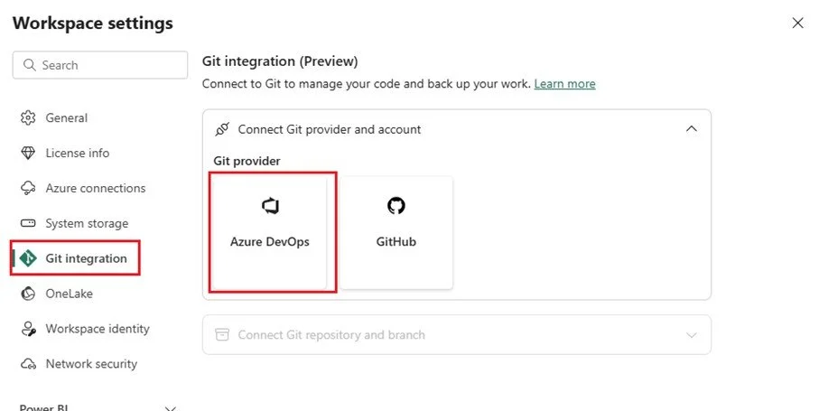 Fabric’s Git integration connects a workspace to a repository, so changes can be committed/pulled as part of a lifecycle process.