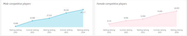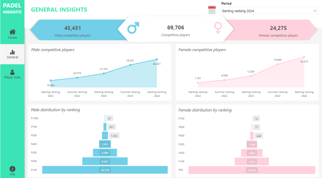 Looking at the number of players, we see that, currently, there are 69,706 players playing padel competitively. If we are going to break this number down by gender, we see that there are 45,431 male padel players ranked P100 or above, whereas on the women side, 24,275 players are currently ranked. We get the competitive nature of a player from the player having a ranking.