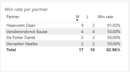 When I look at which partner I had the most success with, I can conclude that I played well with Daan Hasevoets. Which is not to say that I have not determined good results with my other fellow players. I also experienced fun and exciting matches with them!
