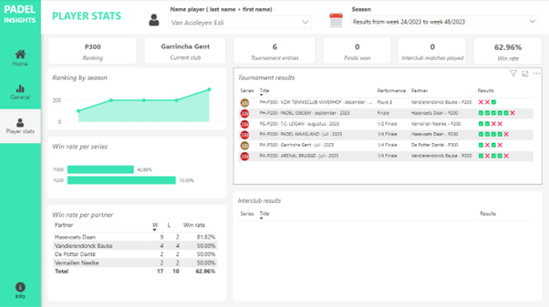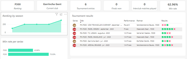 To access a player’s current data, we’ve opted to compile all information about a player into a clear summary, on an individual basis. By searching for a player’s name (in this report, last name + first name), one can view various statistics. As an example, I’ve taken my own dashboard from the autumn season of 2023.