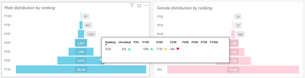 If we hover our mouse over the funnel graph in the report, it is possible to see how the current ranking is structured compared to the previous ranking calculations. The tooltip shows how many players have risen, fallen or remained the same compared to the previous ranking calculation.