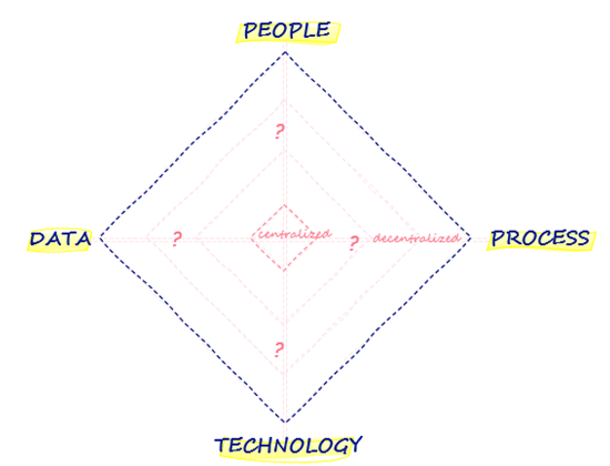 The Technology axis assesses the distribution and integration of technological tools and platforms. Centralized technology frameworks offer the advantage of uniformity and simplified maintenance, but they may lack the adaptability required in a rapidly evolving technological landscape. Decentralized technology architectures, on the other hand, promote the use of diverse tools and solutions that can be customized to meet the unique requirements of different departments or projects. This approach can lead to increased innovation and better alignment with specific business goals.