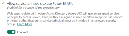 To start, you’ll need a service principal. This is needed for authentication with the Power BI service. Make sure to assign it the necessary permissions in the Power BI Admin Portal, including enabling API access.