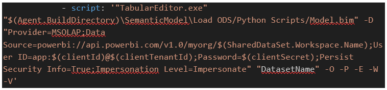For dataset deployment, the Tabular Editor CLI is a powerful choice, particularly if you’re using Power BI Premium, Premium Per User or a Fabric Capacity. Only in those cases, it is possible to use the XMLA-endpoint of the workspace to deploy your data model. Depending on the solution you have, you can overwrite the parameters of the semantic model in your .BIM file or you can give the correct ones with the command as the ‘connection’. The .BIM file contains the logic of the dataset.