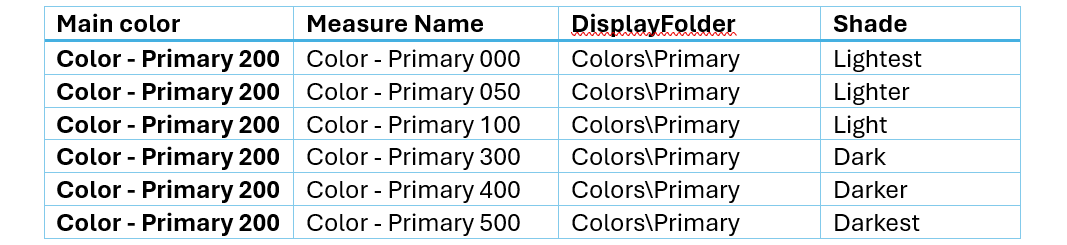 When looking at the first line, we see the “main” color which will be created as the measure ‘Color - Primary 200’ by the script. On the rows below, there are several variations that represent shades of the main color.