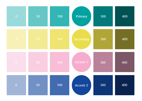 Instead of naming colors by the hue (e.g., “Blue”), name them by semantic role (Primary, Secondary, Accent1, Accent2). Then add a 3-digit shade suffix that scales lighter/darker: