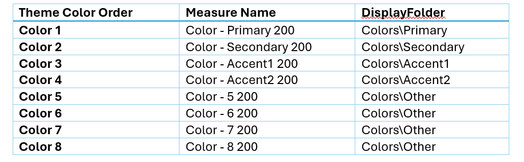 After the extraction of the colors’ hex codes, the script will create the base color measures in the table and display folder you specified.