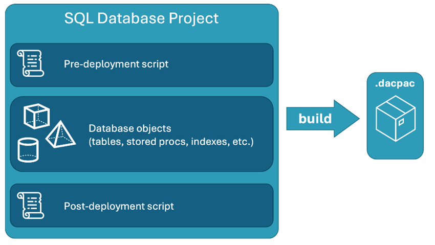 Let’s first reiterate on the concept of a .dacpac. Database projects consist of pre- and post-deployment scripts along with the database objects (like tables, views, stored proc,...). These components are then built and will generate a .dacpac file. This file can then be published to another database (the production database in this case).