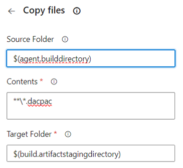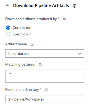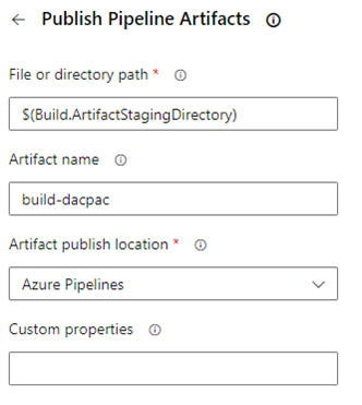 This will copy our dacpac file from the build to the artifact staging directory. After this task, add the Publish Pipeline Artifacts task. Give the directory path and an artifact name: