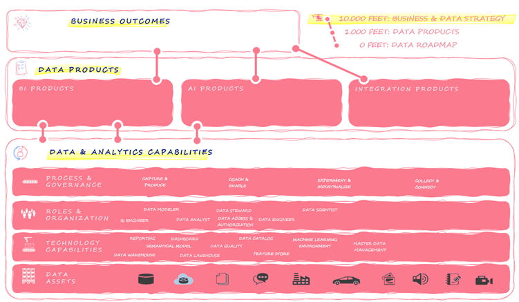 Moving a step down from the business outcomes, we have data products. These products serve as the tangible outputs of our data strategy and are categorized into three main types: