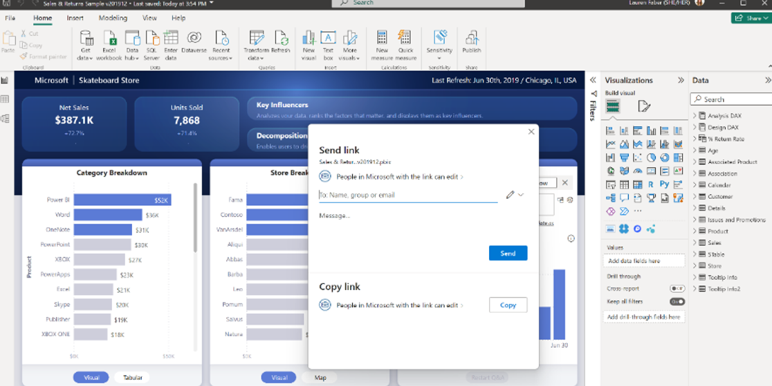 If you’re collaborating on a report in a small development team it is worth noting that there is OneDrive and SharePoint integration available. This way you can use the version control from SharePoint to restore your report to a previous point. Also, with the Share button at the top right of the screen you’ll be able to use standard SharePoint and OneDrive UI to get a shareable link or send it to the people who need it.
